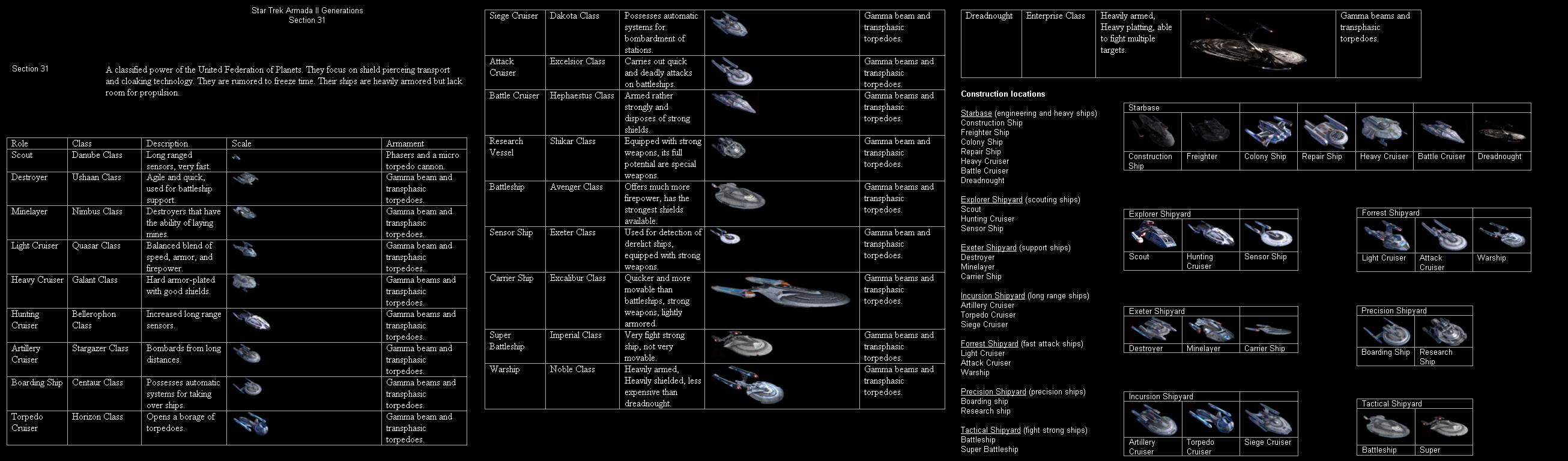 Utopia wrote:Section 31 has shield pierceing transporting tech and cloaking. They are slower and more armored than the feds. Also includes the exeter class, excalibur class, and the J but I'm calling it enterprise class.