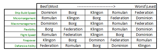 Also, divide ship defense and map defense. The Dominion have the worst ship defense, and the Klingons actually have very good map defense because of all their yards.